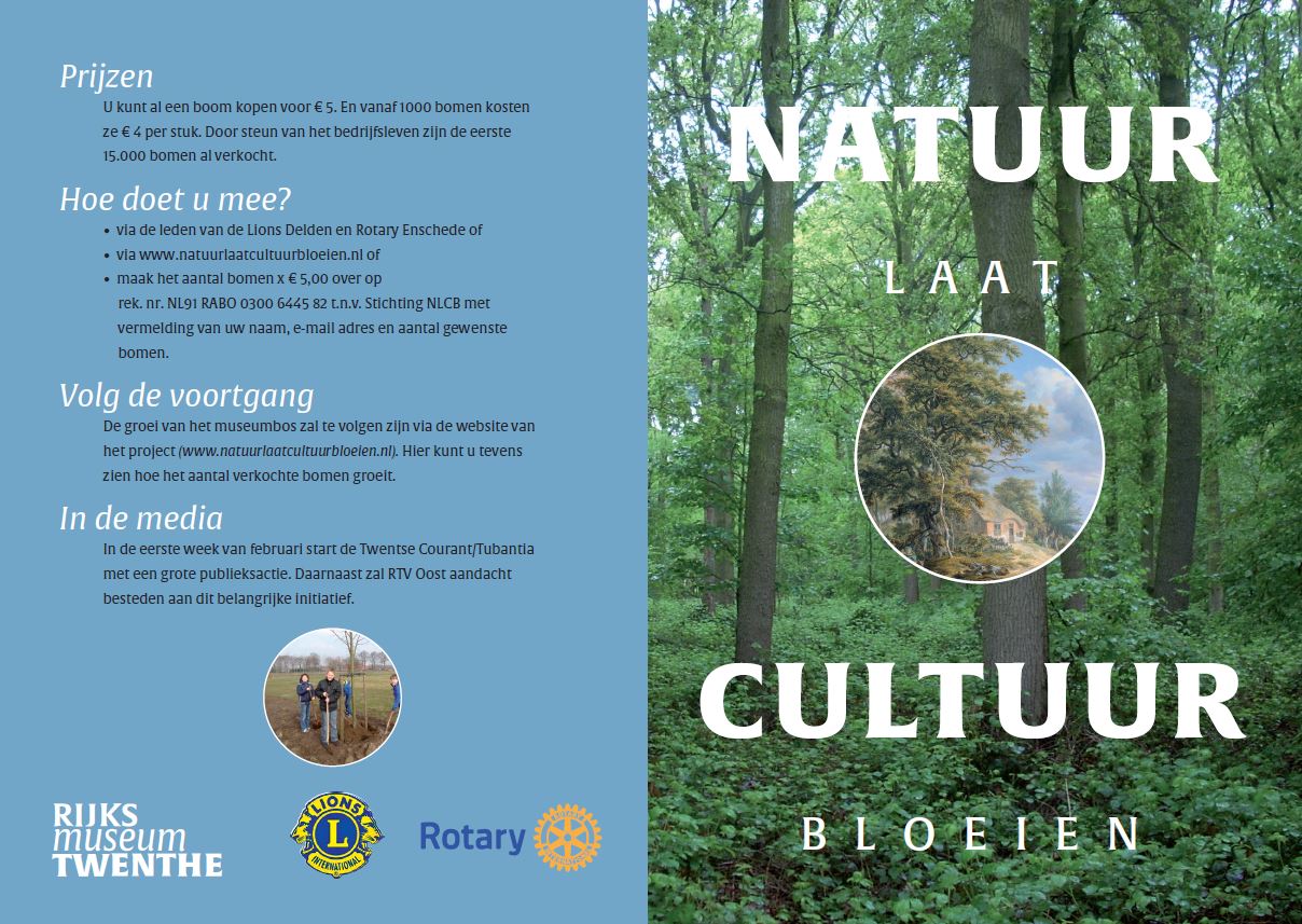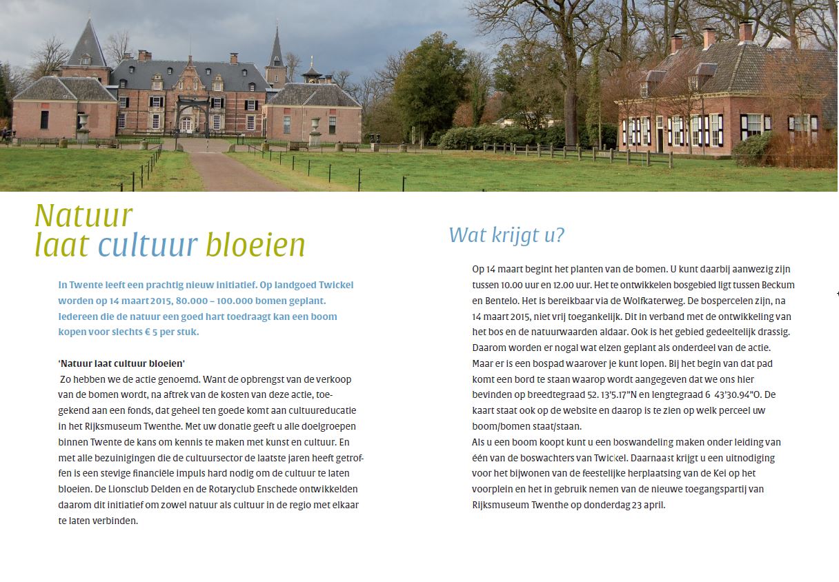 Iedereen die de natuur een goed hart toedraagt kan een boom kopen voor slechts € 5 per stuk. Hieronder kunt U lezen hoe Natuur en Cultuur met elkaar verbonden worden wanneer U meedoet. De opbrengst komt geheel ten goede komt aan cultuureducatie in het Rijksmuseum Twenthe. De Vrienden van Twickel steunen deze actie. We hopen dat al onze leden één of meerdere bomen gaan kopen. Klick op de afbeeldingen voor een leesbare vergroting en meer details of download de folder : Natuur laat cultuur bloeien
