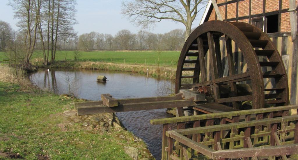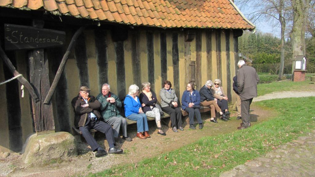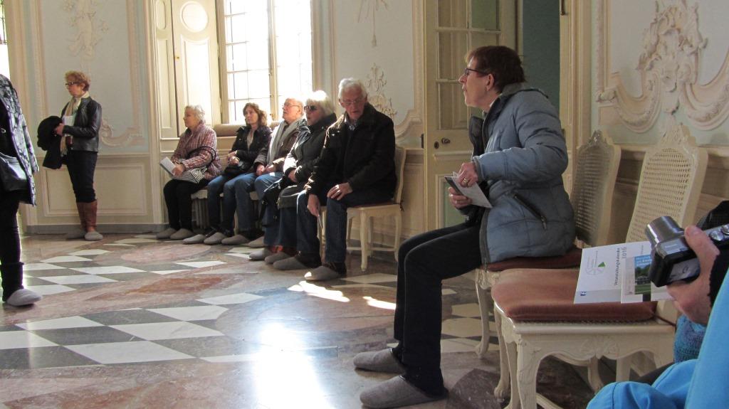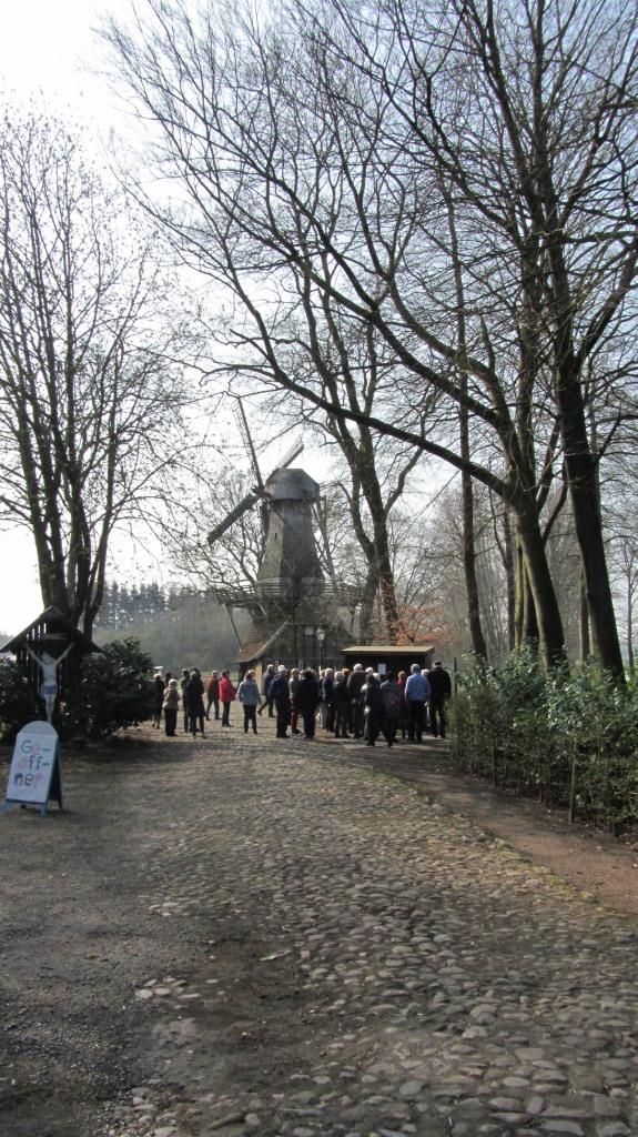 Op 15 april, de derde dag dat de Vrienden van Twickel naar Schloss Clemenswerth reisden, ging ik mee. Om half 9 werd de bus in Delden uitgezwaaid door leden van de activiteitencommissie en het bestuur en reden we naar het Lähdener Hof in Emsland waar koffie en fantastisch veel soorten Kuchen gereed stonden. Vlakbij was de Hüvener Mühle, een angstvallig scheefgezakt maar stevig bouwwerk dat bestond uit een watermolen uit 1532 (gerenoveerd in 1802) waar in 1851 een windmolen bovenop was gezet. Een wonderlijk bouwwerk dat begin deze eeuw echter danig in verval was geraakt. De omringende gemeenschap zette een actie op en met steun van jong en oud werd de molen in 2006 opnieuw ingewijd. Met terechte trots lieten de twee rondleiders de molen, de techniek en het uitzicht vanaf het spekgladde plankier op 15 meter hoogte zien. Ook hier werden we vriendelijk uitgezwaaid, ditmaal door de twee gidsen.