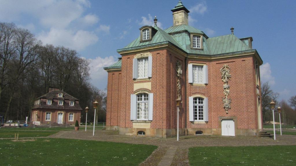 Schloss Clemenswerth bestond uit een achtkantig jachtslot met rondom acht gebouwtjes en acht zichtassen die tot ver in het landschap van gras en bossen leiden. Deze stervorm bleek een vernuftige stedenbouwkundige opzet: het voelde aan de ene kant geborgen, aan de andere kant ervoer je ook de weidsheid van de ruimte rondom. Na een warme lunch in de Schlosskeller bezochten we het jachtslot, waar we met slofjes aan over de marmeren vloer gleden. Een barok gebouwtje dat eigenlijk tamelijk klein was. Architect Schlaun had echter slimme bouwkundige trucjes uitgehaald waardoor het geheel groter oogde. Ook het kerkje was heel barok: overal geschilderde engeltjes, grillig beeldhouwwerk en een prachtig mini-orgeltje in de hoogte. Mijn mede-reisleider Marcel Klieverik barstte plots uit in Byzantijns gezang waarmee hij de prachtige akoestiek treffend liet horen. In het kloostertje ernaast woonde nog één Kapucijner monnik. Daarachter bleek nog een fraaie tuin te liggen met enorm hoge, in vorm gesnoeide heggen en een Gloriette, een klein open gebouwtje.